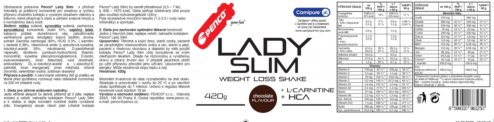 LADY SLIM je nízkoenergetický práškový koncentrát pro přípravu chutného koktejlu, který nahradí jedno až dvě běžná denní jídla. Svým složením odpovídá nejnovějším poznatkům a předpisům v oblasti racionální výživy. Náhrada 2 jídel denně při nízkoenergetické přispívá ke snížení hmotnosti, náhrada 1 jídla k udržení hmotnosti po jejím snížení. Nutričně vyvážená dieta LADY SLIM zajišťuje přísun biologicky hodnotných bílkovin, polynenasycených mastných kyselin, lecitinu, vitamínů, minerálů a stopových prvků, potřebných pro správnou funkci organizmu i při značně sníženém příjmu základních živin a mikroživin během redukční kúry. Přítomné bílkoviny přispívají k udržení svalové hmoty, vitamíny A, C, B6 a B12 podporují normální funkci imunitního systému.