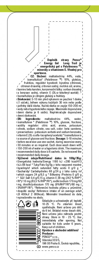 Penco® ENERGY GEL LONG TRAIL zvyšuje hladinu sacharidového „paliva“ před a během výkonu. Obsahuje speciální směs komplexních sacharidů (maltodextrinů) a jednoduchých cukrů (glukózy a fruktózy) a nyní nově i Palatinosu pro postupné uvolňování energie během déletrvajících sportovních výkonů.