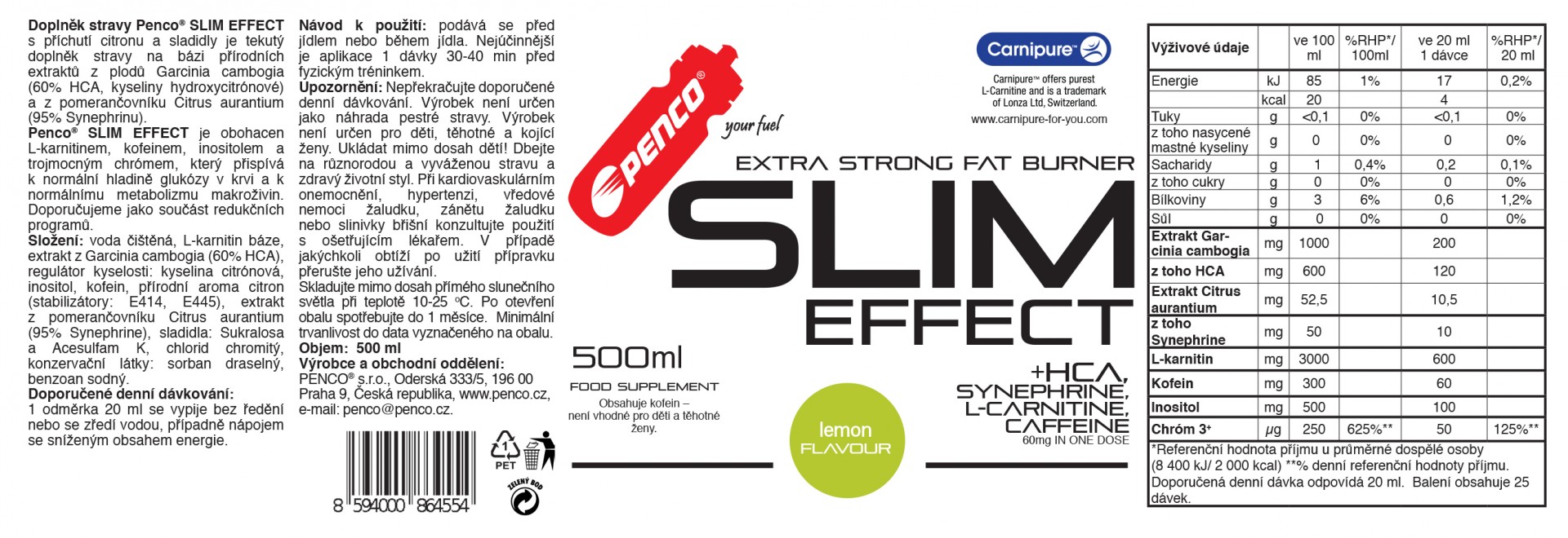 Slim Effect je tekutý doplněk stravy na bázi přírodních extraktů z plodů Garciniacambogia (60% HCA, kyseliny hydroxycitrónové) a z pomerančovníku Citrus aurantium (95% synephrinu, bezpečného analogu efedrinu), které se používají v tradiční čínské medicině k regulaci tělesné hmotnosti. Slim Effect je obohacen L-karnitinem, kofeinem, inositolem a trojmocným chromem, který přispívá k normální hladině glukózy v krvi a k normálnímu metabolizmu makroživin.